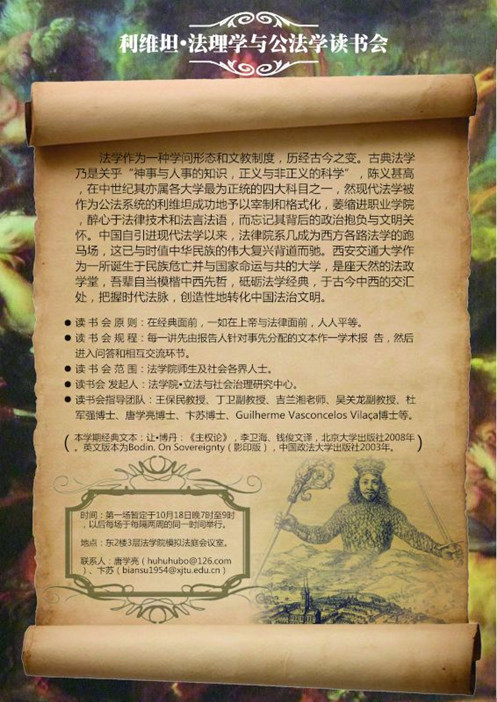 基于以上种种考量,并配合学校“思想交大”建设和学院法理学和公法学的学科建设,法学院“立法与社会治理研究中心”发起创办“利维坦·法理学与公法学读书会”系列活动。本学期该活动选取的经典文本为让·博丹的《主权论》,并于10月18日晚7时在学院会议室举行了首场活动,法学院丁卫副教授、吉兰湘老师、彭何利博士、苏青博士、王朝恩博士、卞苏博士、唐学亮博士等10余位师生参加。主权理论是现代民族-国家兴起的理论前提,而民族-国家又是现代社会最重要的一个政治与法律现象,并与中国近代以来持续至今的伟大而艰难的国家转型勾连起来,因此,不得不察。在该场读书会活动中,主讲教师唐学亮针对博丹《主权论》一书的“导论”部分,就“为什么读博丹?”、“怎么读博丹?”、“博丹的思想里程与理论建构”以及“博丹理论的缺陷”等四个方面做了一个提纲挈领而又不失理论深度的学术报告。之后,就报告的内容及书中所启示的一些重大理论与现实问题,与会人员各自发表了自己的看法,并展开了热烈的讨论。首场读书会活动取得了预期的效果,我们将在两周后的同一时间举行第二场活动。“路漫漫其修远兮,吾将上下而求索”!