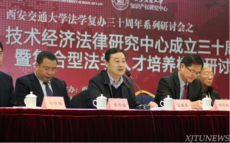 研讨会于28日上午在南洋大酒店开幕。中国工程院院士汪应洛、陕西省委政法委副书记、综治办主任王永明、陕西省高级人民法院副院长田平利、陕西省知识产权局局长巨拴科、西安交大副校长王铁军、陕西省人大教科文卫委员会办公室主任赵建军、西安市法学会专职副会长黄必方、西安交大法学院副院长李万强等科技法学、知识产权法学界著名专家学者以及相关校友等一百五十余人出席了开幕式。开幕式由西安交大技术经济法律研究中心、知识产权研究中心主任马治国主持。