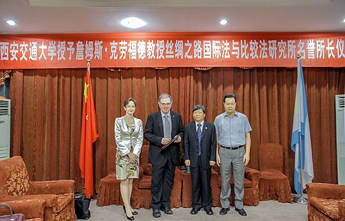 7月24日下午,Crawford教授受聘我校丝绸之路国际法与比较法研究所名誉所长和讲座教授仪式举行。王树国校长在科学馆会见了Crawford教授,并向他颁授聘书。随后,陕西省委常委、陕西省政法委书记安东,陕西省人大常委会副主任、西安交大党委书记张迈曾同Crawford教授进行了交流。省外办副主任姚红娟、卢天健副校长、宫辉副书记、法学院院长单文华、国际处处长梁莉、高层办主任王荷凤、科研院副院长贾毅华等出席了相关活动。