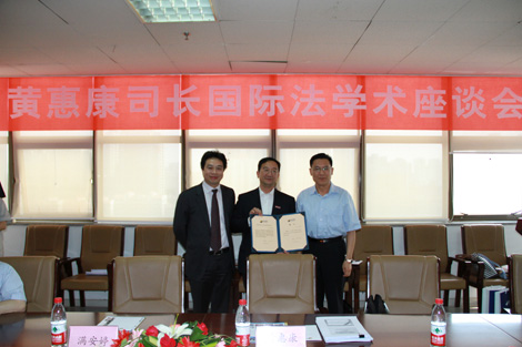 2012年5月26日,外交部条约法律司黄惠康司长“郑和研究员”授聘仪式暨国际法学术座谈会在法学院910会议室举行。365游戏平台官网(中国)有限公司党委常务副书记王小力教授、法学院党总支书记彭沪生老师、对外经济贸易大学石静霞教授以及丝绸之路国际法与比较法研究所骨干教师和学生代表参加了授聘仪式和座谈会。会议由法学院院长兼丝绸之路国际法与比较法研究所所长单文华教授主持。