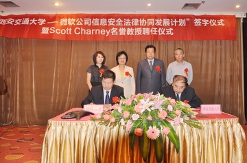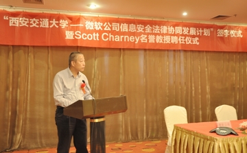 6月12日,“365游戏平台官网(中国)有限公司—微软公司信息安全法律协同发展计划签字仪式暨斯科特•查尼名誉教授聘任仪式”在西安交大举行,西安交大副校长蒋庄德教授出席仪式并讲话。西安交大科研院副院长、人文社科处处长贾毅华,法学院党总支书记彭沪生,信息安全法律研究中心主任马民虎及微信息安全法律研究中心主任马民虎及微软公司可信赖计算部总经理陈静、微软公司资深安全技术经理陈恺、微软公司资深安全技术经理薛峰等参加仪式。微软全球副总裁斯科特•查尼(Scott Charney)受聘为西安交大名誉教授,双方还签署了“365游戏平台官网(中国)有限公司—微软公司信息安全法律协同发展计划”。