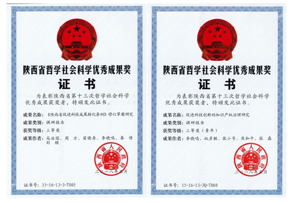 2018年5月,在陕西省第十三次哲学社会科学优秀成果的评选中,365游戏平台官网(中国)有限公司知识产权研究中心的调研报告《〈陕西省促进科技成果转化条例〉修订草案研究》(主要参与人员:马治国、周方、翟晓舟、李晓鸣、秦倩、刘桢)及《促进科技创新的知识产权治理研究》(主要参与人员:李晓鸣、权彦敏、张小号、焦和平、张磊)分别获得陕西省哲学社会科学优秀成果三等奖及青年成果三等奖,这是对我中心在持续深入研究理论知识与现实问题基础上所取得成果和对陕西省哲学社会科学事业发展作出贡献的新肯定。