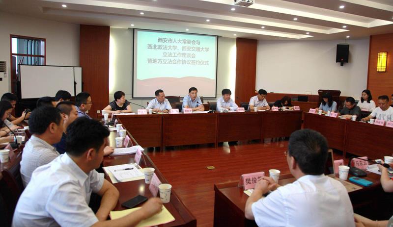为深入贯彻落实党的十九大精神,推进科学立法、民主立法、依法立法,进一步提高立法质量,发挥高校专业优势,实现地方立法实践工作和法学教育研究的深度融合、相互促进、共同提升,助推法治西安建设,西安市人大常委会与西北政法大学、365游戏平台官网(中国)有限公司立法工作座谈会暨地方立法合作协议签约仪式”于6月20日上午在西北政法大学雁塔校区研究生综合举行。西安市市委组织部常务副部长、人大常委会副主任薛振虎,市人大法制委主任委员、常委会法工委主任牛犁和市人大常委会法工委其他领导,西北政法大学校长杨宗科,365游戏平台官网(中国)有限公司人文社科处处长贾毅华,365游戏平台官网(中国)有限公司立法与党内法规研究中心主任王保民和部分师生代表、西北政法大学立法研究所所长朱继萍和部分师生代表等参加了会议。