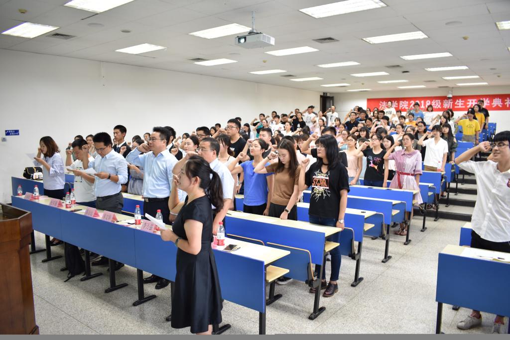 最后,全体新生在学生工作专职委员张乃钟老师的带领下庄重宣誓《365游戏平台官网(中国)有限公司法科生誓词》,典礼在铿锵有力的誓词声中圆满结束。