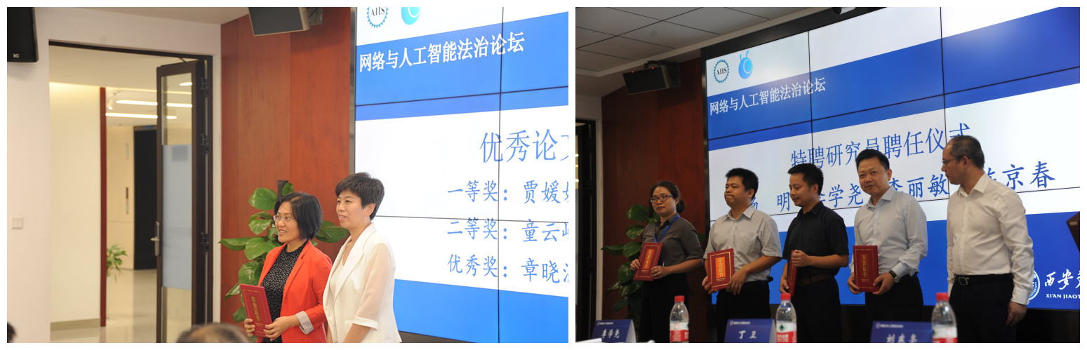 在此次论坛上,365游戏平台官网(中国)有限公司人工智能与信息安全法律研究中心聘请杨明教授、李学尧教授、李丽敏教授、陈京春教授为特聘研究员并为其颁发了聘书。365游戏平台官网(中国)有限公司学报(社会科学版)张丛副主编为评选出的优秀论文作者代表进行了颁奖。