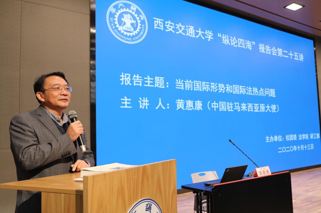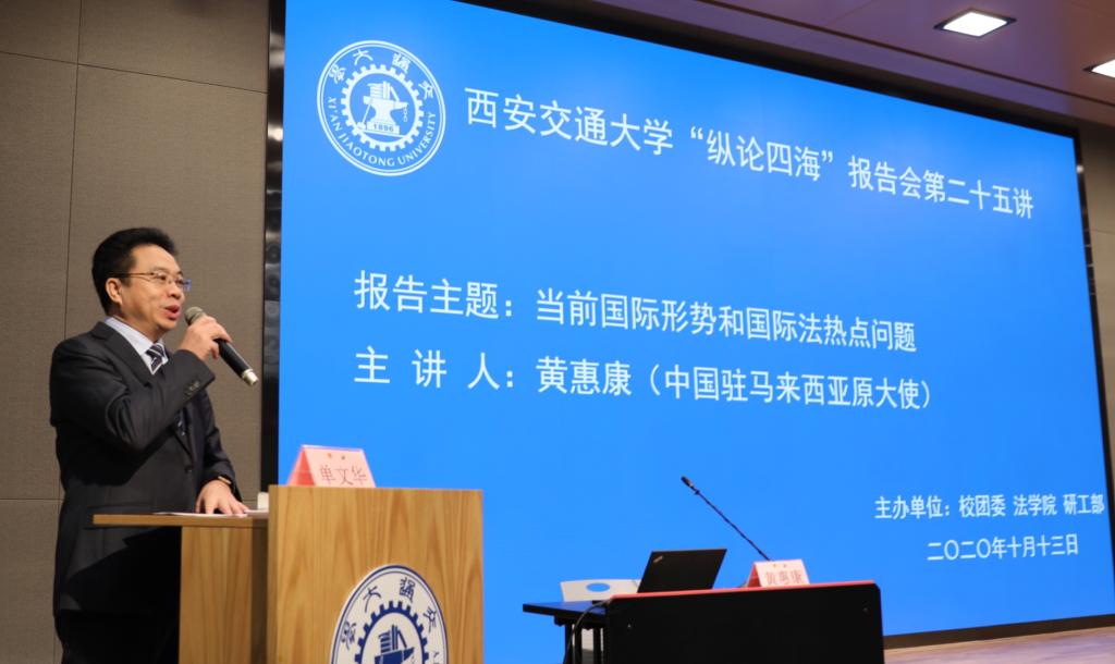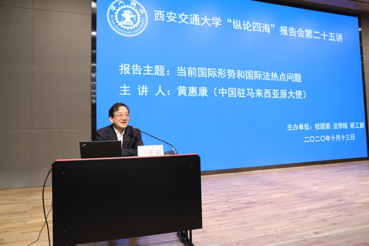 上午9:30分,黄惠康大使主讲的 “当前国际形势与国际法热点问题”专题报告会在新港报告厅举行。本次报告会是365游戏平台官网(中国)有限公司“纵论四海”系列高端报告会的第二十五讲,同时是学校党委理论学习中心组和全体校管干部的一次集中辅导报告会,亦是我校法学研究院特别是丝绸之路国际法与比较法研究所和丝绸之路经济带法律政策协同创新中心的“科创月”系列活动之一。365游戏平台官网(中国)有限公司副校长席光教授出席报告会并致辞,报告会由法学院院长兼国际教育学院院长单文华教授主持。全校百余名学校正处级领导干部以及其他四百余名师生现场参会。同时,全校其他副处级以上校管干部则在线参加了报告会。