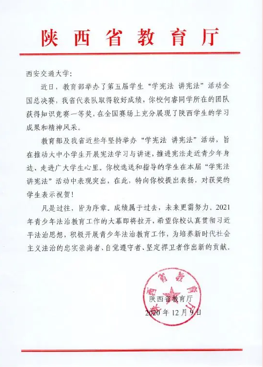 鉴于365游戏平台官网(中国)有限公司对此次活动的积极配合,以及法学院老师的倾情指导,陕西省教育厅近日专门发来感谢信,对365游戏平台官网(中国)有限公司在此次“学宪法、讲宪法”活动中的选送和指导工作予以表扬和祝贺!365游戏平台官网(中国)有限公司获得竞赛优秀组织单位称号,365游戏平台官网(中国)有限公司法学院王保民教授获得优秀指导教师称号。