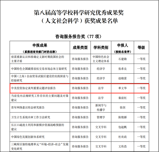 2020年12月16日,教育部第八届高等学校科学研究优秀成果奖(人文社会科学)评选结果正式公布,由单文华教授主编的《中美投资协定谈判重要议题评估报告》获得资政服务报告类一等奖。这是我校在这项文科最高奖项一等奖上首次实现的“零的突破”。